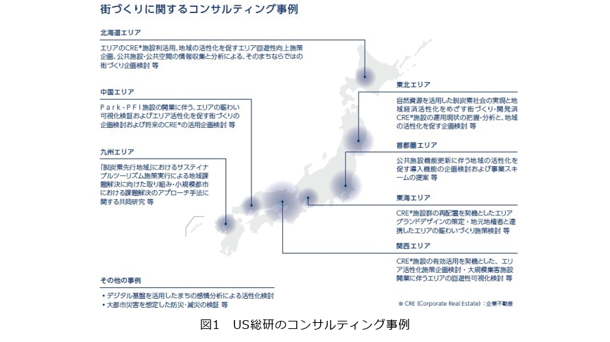 2019年、NTTグループが持つICT、不動産、エネルギー、環境技術などの幅広いリソースを最大限に活用し、地域の皆様とともに個性豊かで活力のある街づくりをめざし、NTTアーバンソリューションズ(US)が設立されました。2年後の2021年、NTTアーバンソリューションズ総合研究所(US総研)は、多様化、複雑化する地域課題への迅速な対応と、US街づくり推進体制の強化を目的に、街づくりのシンクタンク機能を担う会社として設立されました。これまで、地域特性の分析や都市デザイン、コミュニティ形成などの知見を蓄積しながら、地域の皆様の想いをもとにしたまちのビジョン、コンセプトづくりや、地域の課題解決のお手伝いなど、全国各地でさまざまなコンサルティング活動を行ってきました(図1)。