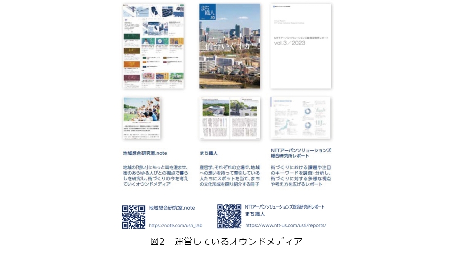 その中で、情報発信にも力を入れており、現在3つのオウンドメディアを運営しています。1番目は、地域の「想い」にもっと耳を澄ませ、街づくりの「今」を考えていくWebメディア「地域想合研究室。note」です。2番目は、地域の文化や歴史、風土、環境などを背景に、街づくりを牽引する人物にスポットを当て、「足で稼ぐ徹底した取材」によって、街の個性を織りなす人々の想いと取り組みを探り紹介する冊子「まち織人」です。3番目は、街づくりに対する多様な視点や考え方をリサーチし、独自の視点で取り纏め提言する「US総研レポート」となります。ぜひ皆様にご高覧いただけると幸いです(図2)。