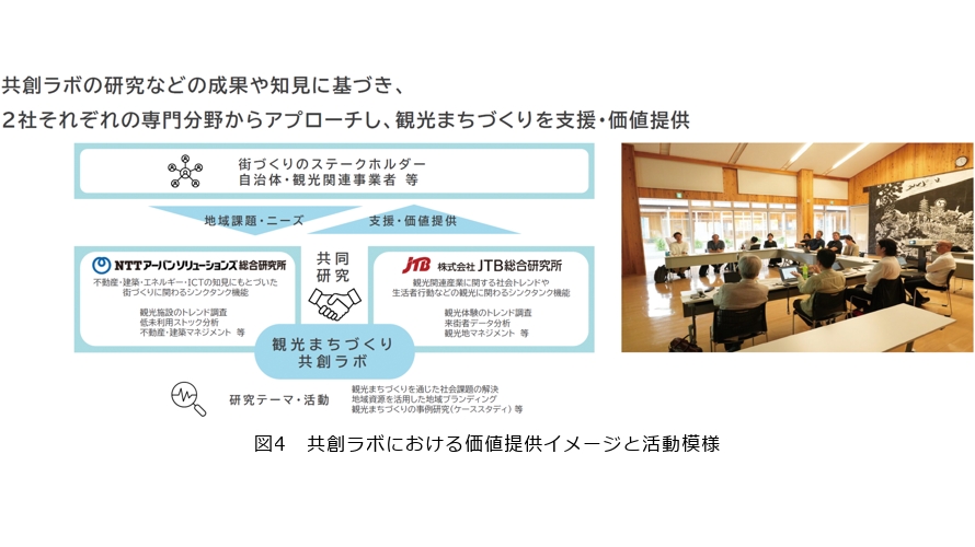最近の特徴的な取り組みでは、株式会社JTB総合研究所(JTB総研)との協業スタートがあります。US総研が持つICT、不動産、エネルギー、環境技術などの知見に基づく街づくりにかかわる専門領域と、JTB総研の持つ観光産業の社会トレンドや生活者行動など観光にかかわる専門領域を掛け合わせ、共同で研究する「観光まちづくり共創ラボ」(共創ラボ)を始動しました(図4)。昨今、地方都市では、大都市圏への人口流出、中心市街地の空洞化、そして山間部の過疎化が進行し、地域経済や生活環境に深刻な影響を及ぼしています。一方、大都市や人気の観光地では、訪日旅行者の増加によるオーバーツーリズムが原因で、交通渋滞や住環境の悪化、観光体験の質の低下など住民や観光客に悪影響を及ぼしています。