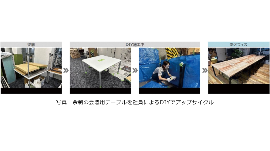昨年度、「ふらっと・コミュニティベース」をコンセプトに、一級建築士資格を持つ社員が中心となりオフィスをリニューアルしたとのことです。「ふらっと立ち寄れる社員間のタッチポイントを散りばめ、フラットなコミュニケーションを促す」ことで、机上検討が多くなりがちなコンサルディング事業に対し、リアルな場所・空間・体験を通したUS総研の「VISION・MISSION」の実践をめざしています。今回のリニューアルに伴い、面積が旧オフィスから60%減少しましたが、フレキシブルな利用に対応する空間の構築、一部什器の廃止など、レイアウトの工夫や必要機能の取捨選択を行うことで、ワークエリアのデスクは旧オフィスと同じ寸法を採用し、業務の快適性を確保できました。また、フローリングやルーバーには、業務上連携のある地方の林業会社から直接仕入れ、商品価値の低い小径木や通常は破棄されてしまう選別外木材を活用することで、自社オフィスのリニューアルを通して地域産業が抱える課題解決をめざしました。さらに、老朽化した什器に対し、社員によるDIYでアップサイクルに取り組み、テーブルには塗装・天板交換を、本棚には収納機能付加などの工夫を施し、持続的に活用する試みを行うことで(写真)、社員参加型の愛着を持てる・環境負荷の低いオフィスの構築をめざしました。今年7月にはオフィス移転から1年の節目でアンケートを実施しました。その結果も踏まえ、さらなるコミュニケーション活性化・コラボレーション効果最大化に向けて各種機能の改善に取り組んでみたいとのことです。