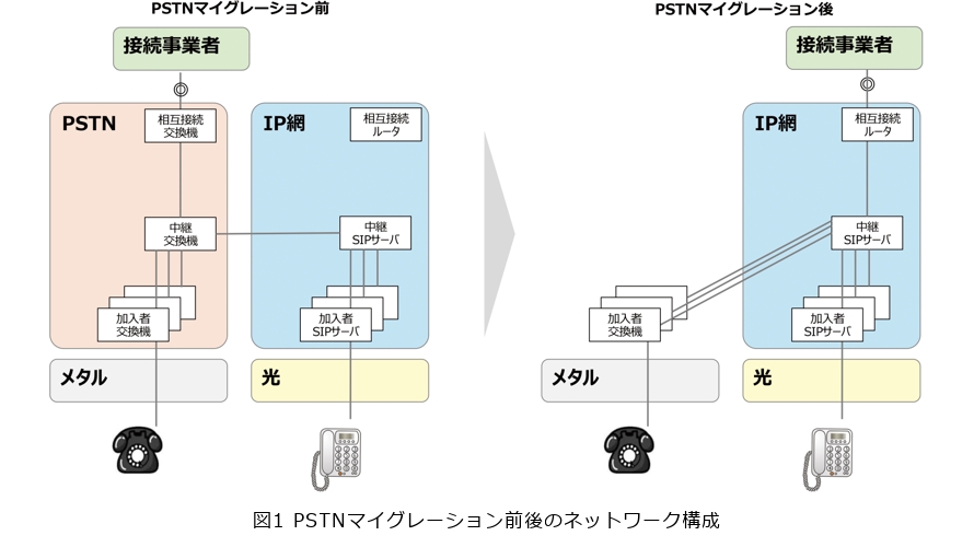 PSTNマイグレーション以前において、NTT東日本・西日本(NTT東西)の電話ユーザ(ひかり電話含む)が接続事業者の電話ユーザと通話する際は、STM-POIを経由して通話を行っていました。また、固定電話ユーザどうしの通話はPSTN内、ひかり電話ユーザどうしの通話はIP網内でそれぞれのネットワークで接続し、固定電話とひかり電話の通話についてはPSTNとIP網を横断して接続していました。
