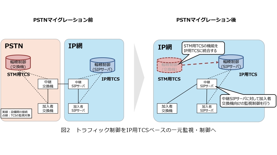 具体的には、STM用TCSの機能のうち、中継ネットワークのIP化に伴い十分な方路帯域が確保できることから、方路上の輻輳を迂回等で制御する回線群指定制御機能の廃止と、IP-POI化に伴うSTM-POIでの制御機能を廃止しました。また、TCSの制御機能を精査し、IP用TCSをベースに一元管理する方向で検討した結果、固定電話ユーザへ着信する輻輳は、中継SIPサーバで輻輳を検知し、制御する方法に変更しました。以上を踏まえて、IP用TCSをベースとしたSIPサーバへの輻輳制御指示を行うことで、すべての電話トラフィックを一元的に監視・制御できるようにしました。