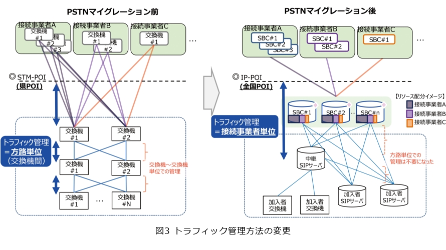PSTNマイグレーション後は、PSTNの中継ネットワークがIP網中心のネットワーク構成(中継ネットワークのIP化)に変更、かつ、接続事業者と接続するSTM-POIが廃止されたため、全国で相互接続点がIP化(IP-POI)されました。このネットワークの構成変更に合わせて、トラフィックの監視・制御の見直しを行いました。