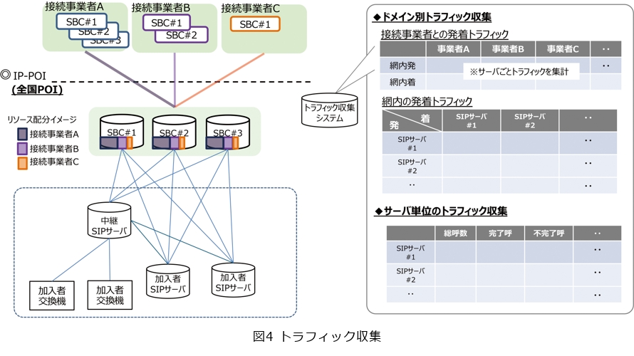 PSTNマイグレーション後は、従来の方路単位のトラフィック収集からドメイン単位でのトラフィック収集へ移行しました(図3)。この方式の移行により、効率的かつ統合的にトラフィック情報の収集・分析が可能となり、その結果、電話網の詳細状況を把握することができました。具体的には、全国のSIPサーバから情報を収集するにあたり、ドメイン単位で総呼数、完了呼数、不完了呼数、同時接続数*2、セッション数*3を取得するようにしました。SIPサーバから発信したトラフィックに対してドメイン単位で分計し、これまで把握が難しかった一般呼やサービス呼の把握も可能とし、複雑な集計処理をすることなく、エンド・ツー・エンドのトラフィックを取得することを可能としました(図4)。