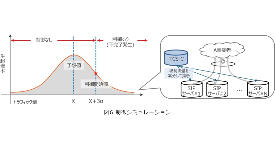 接続事業者とのトラフィックは、接続事業者単位のトラフィックを監視し、制御を行います。トラフィック制御は、事前に接続事業者と定めたトラフィック量に収まるように、接続事業者ごとに制御トラフィック量(呼/分)を規定しています。制御トラフィック量(呼/分)は、IP網全体で1分間に接続できる呼数を示しており、制御が開始された際には、IP用TCSが制御トラフィック量を基に各SIPサーバへトラフィック制御する呼数値を計算し、制御指示をします。接続事業者とのトラフィック制御が発生した際のシミュレーションを重ねて、接続事業者との呼数が瞬間かつ突発的に増えた場合にも過剰な制御が働かないことを確認しました(図6)。