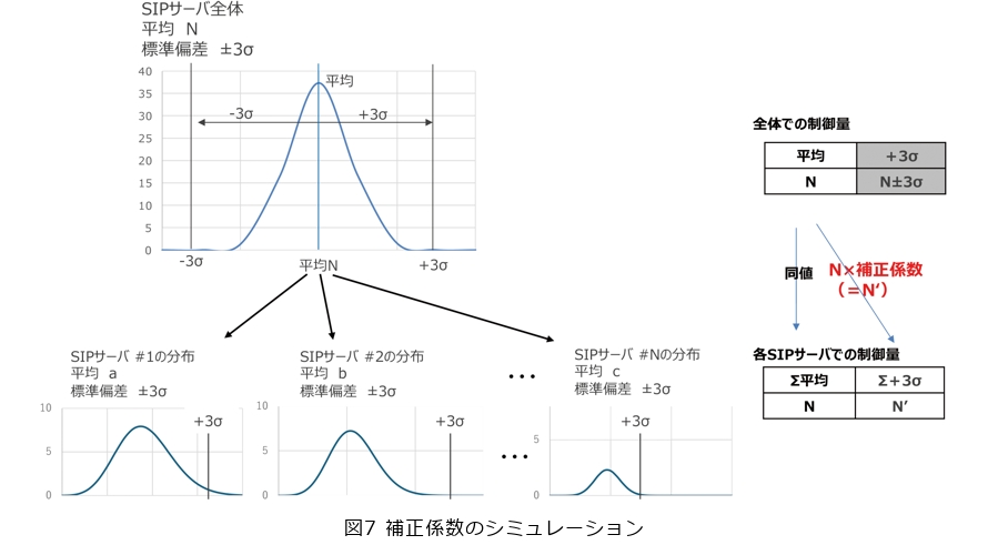 接続事業者との制御トラフィック量は、ネットワーク全体をみた値で想定値を作成しました。しかし、各SIPサーバへ制御指示を分配した場合に、トラフィック量は割り切れず、単純にSIPサーバ数で割った値を分配した場合、SIPサーバごとのトラフィック制御が規定値以上に掛かってしまう可能性がありました。そこで、既存のトラフィック量を集計し、トラフィック制御が過剰に掛からないように補正する機能を具備しました。補正するための係数として、全体のトラフィック量と分配された各SIPサーバでのトラフィック量を比較し、分割後にも制御がかかりすぎないような値を求めました(図7)。