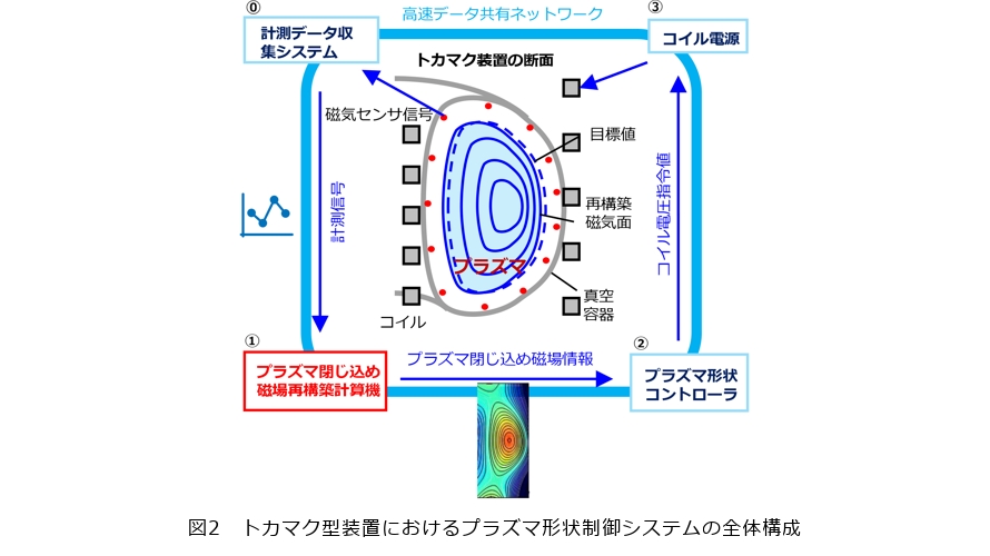 再構築では、マクスウェル方程式などの電磁気学の法則に基づいたプラズマ物理の計算式を使い、膨大な計算を段階的に行います。その後、目標値と再構築された磁場の空間分布のズレを計算し、目標値に近づけるための次の制御値を算出します(図2②)。そして、コイル電源に指令を出し(図2③)、コイルの電流値を変更して磁場を制御します。