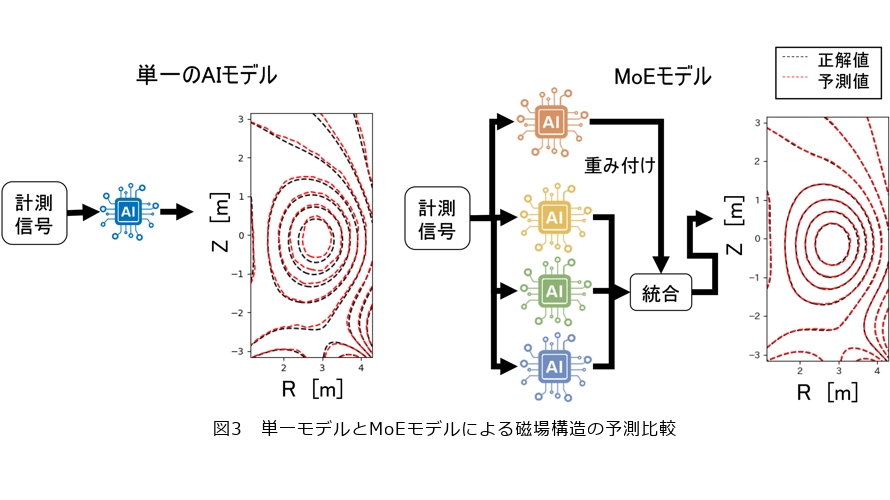 NTT宇宙環境エネルギー研究所ではQSTと共同研究を実施し、磁気センサの信号を入力として与えることで、瞬時にプラズマの磁場分布を予測するAIモデルを開発しました(3)。最初は単一のニューラルネットワークモデルを使用しましたが、実験装置のように動きが激しく変化する状況では、予測精度が不十分でした。定常状態、つまりプラズマが一定時間変動しない状況ではそれなりに正しく動作しましたが、加熱や電流制御などでプラズマがダイナミックに変化すると、予測が追いつかなくなるのです。この課題を乗り越えるために、共同研究において「混合専門家モデル(MoE:Mixture of Experts)*6」という仕組みを取り入れました。これは複数のAIをチームとして扱い、それぞれのAIが得意な状況で活躍できるようにする考え方です。例えば、プラズマの形状が安定しているデータや、形状が極端に変化するようなデータなどを大量に用意し、複数のAIを同時に学習させます。その際に、状況把握・指令制御AIがどのAIに学習させるかを決めることで、最終的に「ゆっくり変化するプラズマが得意なAI」や「急激に動くときに強いAI」など、いくつかのモデルが出来上がります。そして、実際の状況に応じて「今はこのAIを多めに使おう」「この2つの意見をバランスよく混ぜよう」と判断することで、MoE全体として柔軟かつ高精度な予測が可能になります。しかも、計算は1回で済むので、高速化が見込まれます。