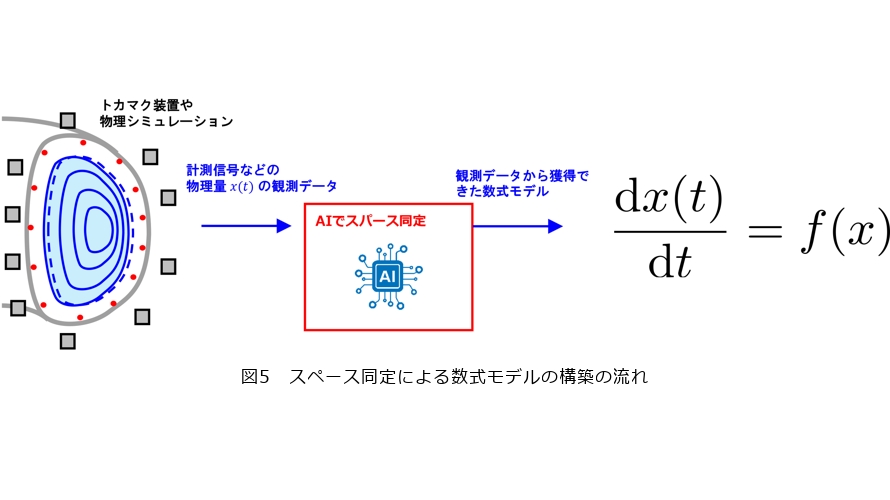 実際に私たちは、プラズマの温度や密度といった観測データを用いて、オラクル性を持つスパース同定を適用し、データが従う簡易な数式モデルを自動的に抽出することに成功しています(図5)。ここで得られる数式モデルは、既存の理論に基づいて定式化されたものとは異なり、観測された現象の背後にある構造を、最小限の数式項で表現するものです。このような数式モデルは、予測精度の高さに加えて、物理的な意味の解釈がしやすく、計算コストの低減といった点でも大きな利点があります。