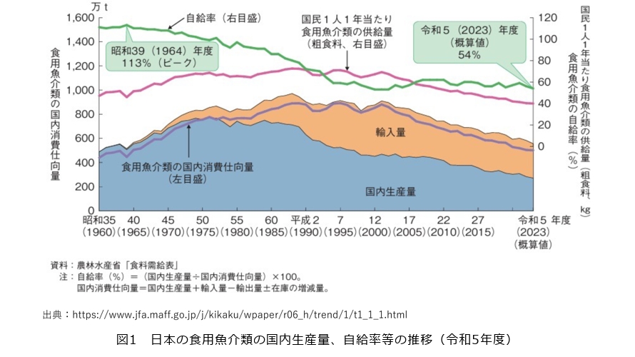 当社が取り組む社会課題は、「食料自給率の低下」と「進行する過疎化」です。日本の食料自給率は先進国の中でも最低水準であり、食料安全保障の観点からも深刻な問題となっています。特に、日本の食文化に根付いている魚介類の国内生産量はピーク時の3分の1ほどに減少し、令和5年度で自給率は54%まで低下しています(1)(図1)。漁業従事者の減少も深刻で、持続可能な水産業の構築が急務です。一方で、世界的な人口増加に伴うタンパク質需要の高まりや環境問題の影響により、栄養価の高い魚の需要は急増しています。これまで輸入に頼ってきた魚介類の調達が困難になる中、国内での安定供給体制の構築が求められています。