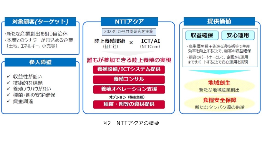 さらに、設備・システムに加え、種苗や餌など陸上養殖に必要な要素を一気通貫で提供する予定です。NTTアクアは、企画から構築、運営までを包括的に支援するコンサルティングを通じて、養殖事業者を手厚くサポートしていきます。