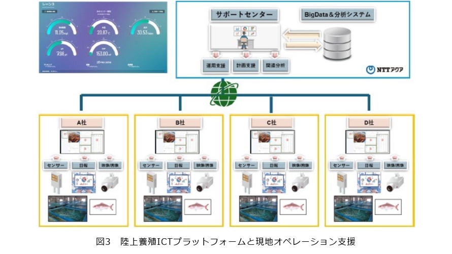 ② ダッシュボードを活用したNTTアクアによる養殖支援:各地域で自律分散して陸上養殖が展開されますが、データはプラットフォーム上の情報(魚行動データ、魚体長・体重データ、分養データ、増肉データ、水質データ等)はNTTアクアが一元管理しており、これらのデータを活用しながら遠隔で養殖事業者を支援します。これにより、養殖経験のない人でも簡単なレクチャーを受けることで養殖することが可能となります。今後、データをAIで分析するなど、新たな価値を提供するビジネスも展開する予定です。なお、魚の異常検知については、NTT宇宙環境エネルギー研究所と共同で研究を行っています。