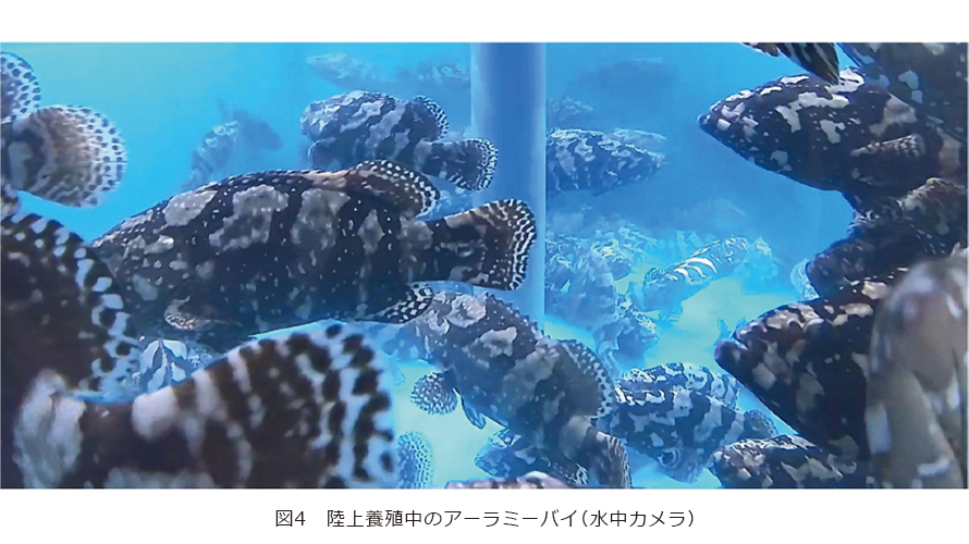 このようなシステムでアーラミーバイを養殖した結果、1年間で体重が500 gから4kgまで増加し、1年間での生存率も98%と良い成績を収めることができました(図4)。
