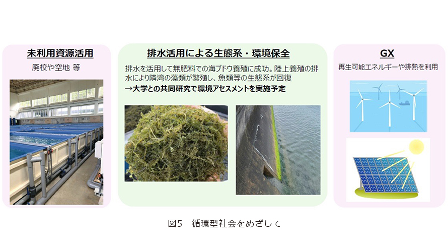 加えて、陸上養殖場には廃校や空地など未利用地を活用し、排熱や再生可能エネルギーを活用する再エネ事業者とも連携して、広義での循環型社会をめざしていきます(図5)。