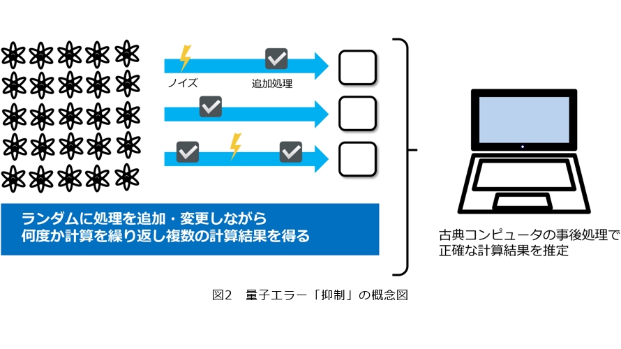 量子エラー抑制というのは、大まかにいえば量子コンピュータからの出力結果を統計的に処理して正しい結果を予想することで、計算結果からエラーを取り除くというエラー削減方法です(図2)。古典コンピュータと呼ばれる従来のコンピュータを使用して、複数の量子プロセッサで測定した結果を統計的処理で予測するため、量子ビット数の限られた現行の中規模量子コンピュータに適した手法とされており、この数年で世界でも盛んに研究され、さまざまな手法が提案されてきています。