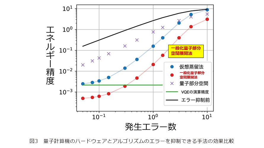 また、複数提案されている量子エラー抑制法どうしを統合し、究極の量子エラー抑制を開発することも行いました。現在、量子エラー抑制法は「外挿法」「仮想蒸留法」「擬確率法」「量子部分空間展開法」などといったさまざまな手法が提案されていますが、この「一般化量子部分空間展開法」はそれらの手法を統合して1つのフレームワークに落とし込んだ「究極形」ともいえます。これは、複数の計算エラーの影響を受けた量子状態のコピーを並列に準備して干渉させることで、計算エラーを実効的に打ち消すことが可能になる手法です。そのエラー抑制効果はこれまでの抑制法と比較して大変性能の高いものとなっています(1)(図3)。そのエラー抑制効果はノイズの影響を受けた量子状態から得られた結果と、この手法でエラー抑制された量子状態から得られた結果を見れば一目瞭然となっています(図4)。