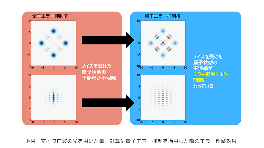 私は量子技術に関してほかにもさまざまな研究を行っていますが、現在もっとも比重高く研究している技術は「連続量エラー訂正法」というものです。これは「光」を用いた新しいエラー訂正法です。「光」の持つエラー訂正能力を利用すると物理量子ビットのエラー数を大きく減らせる場合があることが分かっています。これまではこの切り口からのアプローチはしていなかったのですが、「NTT=光」という強みを活かして進めている研究になります。この部分は研究所間の垣根を越えてもっと議論を交わしてみたい部分でもあり、大きく研究が飛躍する要素が眠っているのではないかと期待しています。当然、「光」を用いたエラー訂正法は未開拓な部分が大きいので、「光」を有効利用してさらに効果の高い量子エラー訂正法および量子エラー抑制法との融合手法を生み出すことが現在の私の目標の1つとなっています。この研究はまだまだやることが多く、実用的なエラー削減が光の系で行える達成目標は目安としては10年後(2035年ころ)でしょうか。とはいえ、理論的には進展がすでにあり、図4は(マイクロ波の光に対してですが)量子エラー抑制を光の量子エラー訂正符号の量子状態に適用し、量子エラー抑制が符号状態の精度を向上できたことを示す結果となっています。