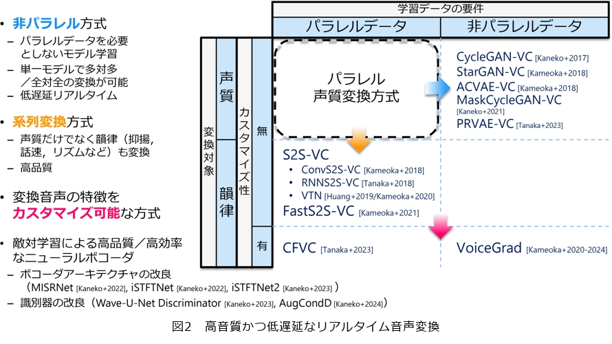 音声変換(Voice Conversion、VC)は、一般に、学習データを用いて音声特徴量の変換則(変換モデル)を事前に獲得し、その変換モデルを入力音声に適用することで実現されます。図2に示すように、この研究分野は大きく2つの観点から分類できます。第一は、学習に必要とされるデータの性質に基づく「パラレル方式」と「非パラレル方式」です。