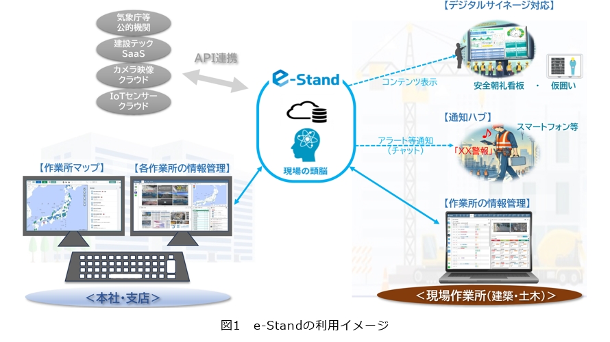 こうした課題に対し、e-Standは建設業界に特化したダッシュボードサービスとして、情報のハブとなることでDXの実効性を高める役割を担います。外部の各種アプリケーションや公的機関の情報とAPI連携し、カメラ映像やセンサデータ、気象・災害情報などを統合的に表示、現場の状況をリアルタイムに可視化することで、迅速な意思決定と行動をアシストします。またSSO機能で、現場に導入している別ツールへのアクセスも簡便化され、現場職員のICT活用のハードルを下げられます。主に本社側での使用を想定する「作業所マップ」機能では、全国各所の現場の状況・情報をダイレクトに確認できるメリットがあり、情報統制を容易にします(図1)。
