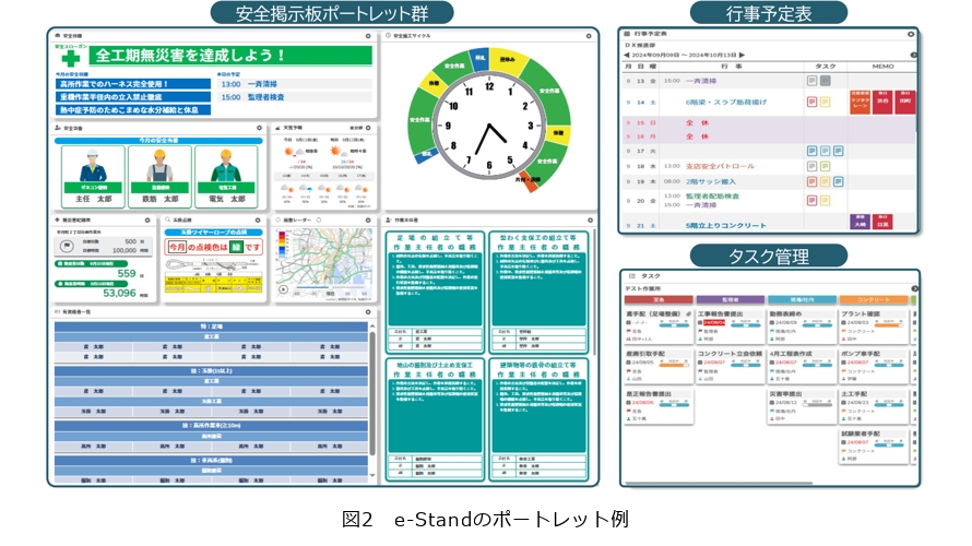 e-Standでは、朝礼看板のデジタル化を想定した「安全掲示板ポートレット群」(安全目標、無災害記録、玉掛ワイヤー点検色、安全施工サイクル、有資格者一覧など)を開発し現場で必要とされる多様なコンテンツを自由にカスタマイズ・レイアウトできます(図2)。