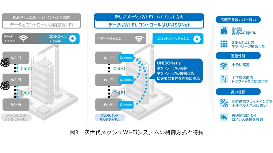 この次世代メッシュWi-Fiは、従来のWi-Fiベースのインバンド方式とは異なり、データチャネルにWi-Fi、コントロールチャネルにソナス独自のIoT無線技術UNISONetを採用したハイブリッド構成とすることで、複雑かつ変化の激しい建設現場の環境でも、安定した通信制御と情報収集(トラブル検知など)が可能になります。特に、同時送信フラッディングは、複数の端末が同時にデータを送信することで、従来のルーティング方式に比べて効率的かつ信頼性の高い通信を実現します。次世代メッシュWi-Fiは数10ホップでも実用速度(建設現場における実証実験での実績値は18ホップ5Mbit/s)を維持でき、専門知識が不要で自動構築・最適化も可能です。