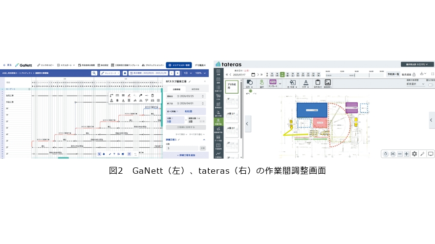 ① スーパーゼネコンである竹中工務店様・清水建設様と協業し、工程表〜作業日報までの各施工管理にかかわるデータを実用的に連携することで「施工管理業務のDX」をめざしている。