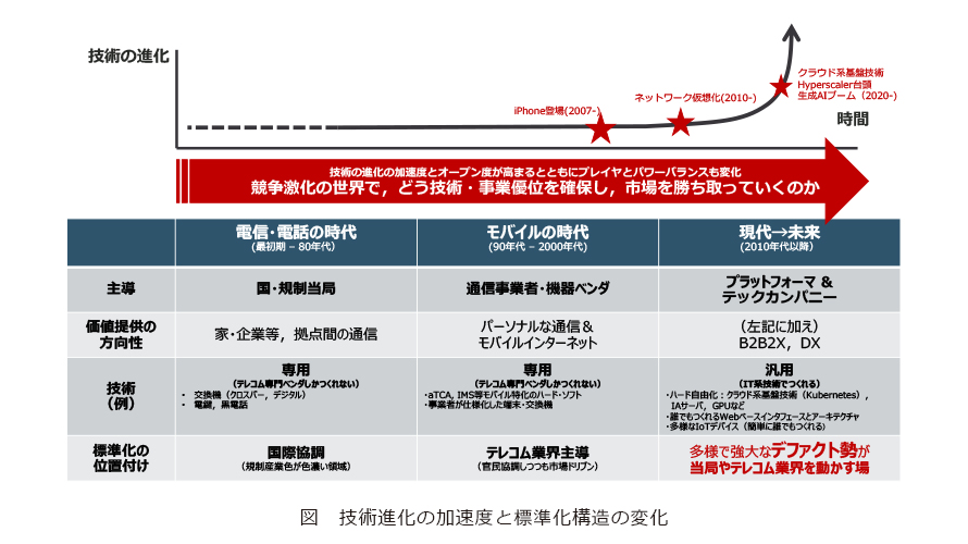 技術進化の加速度と標準化構造の変化の概要を図に示します。近年の技術革新〔スマートフォンの台頭、ネットワーク仮想化、クラウドネイティブ化*3、生成AI(人工知能)ブームなど〕によって、通信産業におけるプレイヤの構図と力関係が変化し、競争が激化しています。その中で、いかに技術的・事業的優位を確保し市場を獲得するかという観点から、標準化戦略の再編が求められている状況が読み取れます。
