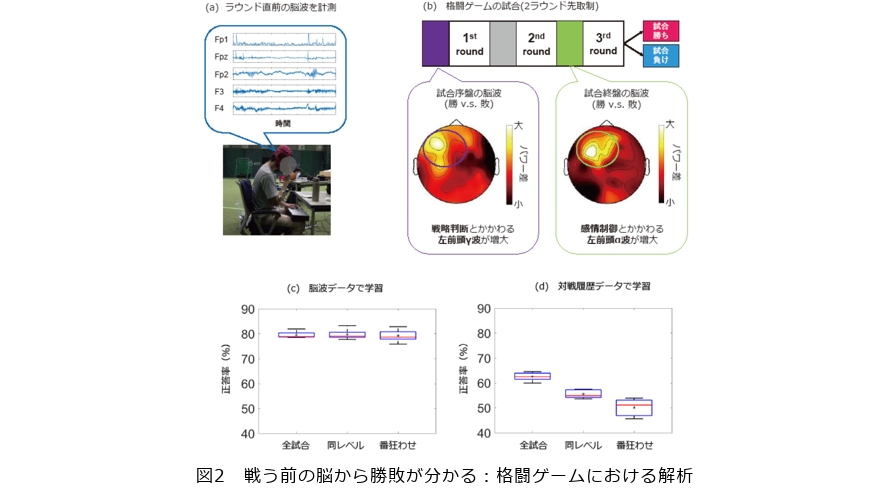 eスポーツでは、格闘ゲーム上級者どうしの対戦で両者の脳波を同時計測しました。その結果分かったのは、試合をする直前から、脳の状態としては勝負がある程度ついているらしいということです。試合の直前8秒間の脳波を調べてみると(図2(a))、結果的にその試合に勝つときと負けるときとで活動が大きく異なる部分があることが分かりました(図2(b))。そこで、試合直前の脳波データを用いて機械学習で勝敗を予測したところ、約80%もの的中率が得られました(図2(c))。