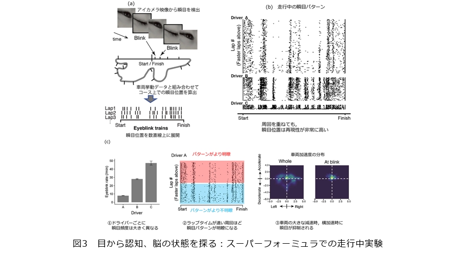 1番目は個人差で、瞬きの多い人も少ない人もいますが、全員トップレベルの選手で、パフォーマンスには関係しません。2番目はラップの速さで、高速で攻めているときほど、つまりリスクや集中度の高いときほど、より瞬きのタイミングのパターンが明確になります。