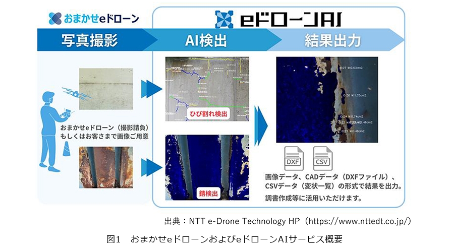 NTTグループにおいても、NTTアクセスサービスシステム研究所を中心とした複数の研究所でさまざまな関連技術に関する研究が行われていますが、NTT e-Drone Technologyにおいて、ドローンによる測距とAI画像解析を組み合わせたサービスとして実用化もされています。サービス概要は以下のとおりです(図1)。