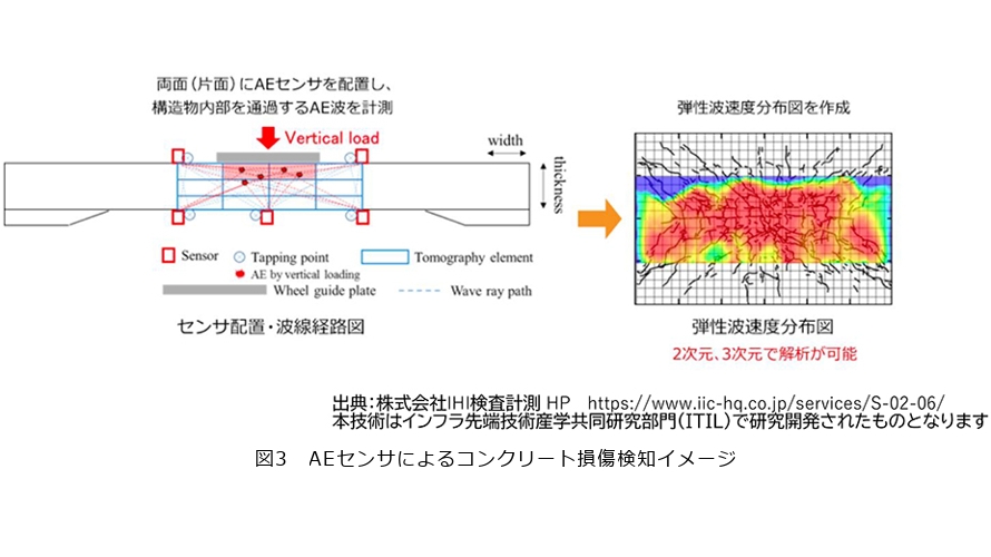 アコースティック・エミッション(AE)は、コンクリート内部の微小破壊やひび割れ発生に伴って生じる弾性波を検出する技術で、目視では確認できない微細なひびの発生を早期に検出でき、損傷の発生・進展をリアルタイムに把握できるため、構造ヘルスモニタリング技術として注目されています(図3)。