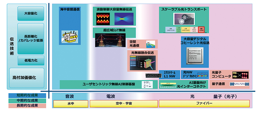 本特集では、ゲームチェンジにつながる革新技術の早期具現化と事業や顧客に求められる差別化技術の確立に取り組むNTT未来ねっと研究所の研究開発方針を紹介する。世界一・世界初の研究成果とIOWN(Innovative Optical and Wireless Network)/6G(第6世代移動通信システム)に貢献する成果を創出する光(量子)・電波・音波を用いた伝送技術およびその高付加価値化の最新取組状況について紹介する。