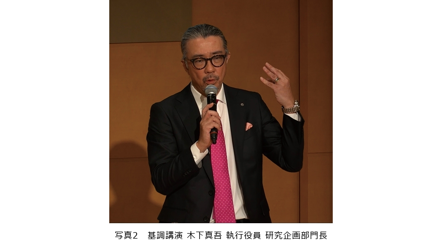 NTT執行役員 研究企画部門長 木下真吾による基調講演は、「IOWN ∴ Quantum Leap」と題して、AI時代の到来から量子技術、現在NTTが研究開発している光量子コンピュータの概要や展望、量子AI、また今回のR&Dフォーラムで発表された研究開発などについて総括しました(写真2)。