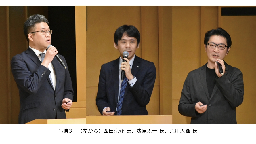 口火を切ったのは、NTT人間情報研究所の西田京介上席研究員、浅見太一主幹研究員、NTTドコモビジネスジェネレーティブAIタスクフォース荒川大輝タスクフォース長の3名でした(写真3)。日本発の大規模言語モデルtsuzumi 2を活用したAIビジネスとその展望について、そのさまざまな関連技術や具体的な関連ビジネスの例を併せて紹介しました。