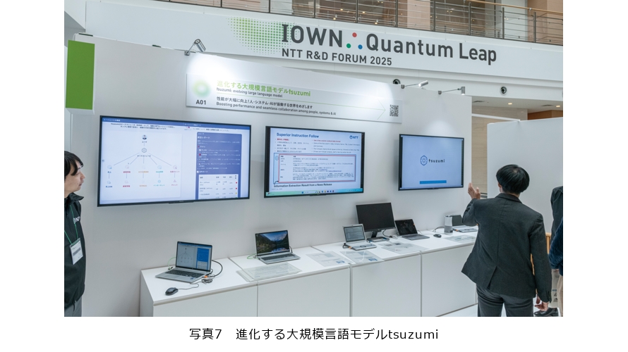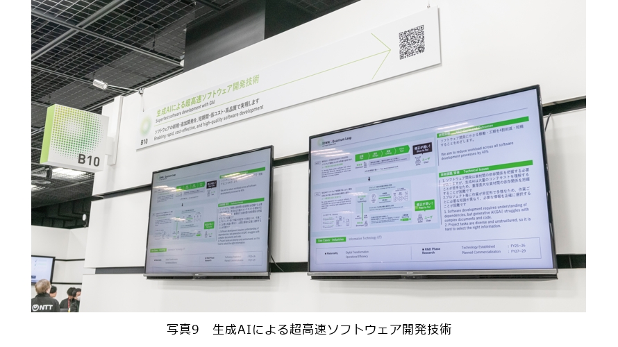 主要な展示として、「生成AI」では最新の軽量LLM「tsuzumi 2」や自然な双方向対話技術を紹介し、「IOWN」では光電融合デバイスの最新版や万博で実証された光コンピューティングの成果を公開しました。また、「量子」では長年の光通信技術をベースにした世界トップレベルの「光量子コンピューティング」について、ハードウェアからソフトウェアまで幅広い研究成果を公開したほか、「サステナビリティ」では中性子線による藻類の品種改良技術や水素輸送技術が展示されました。さらに、「モビリティ」では交通事故ゼロをめざす「交通分野向けワールドモデル」、「NW」ではAIによるネットワーク自律復旧や社会インフラを支える衛星・光ファイバの活用、「セキュリティ」ではWeb3関連技術とデジタルトラスト基盤を紹介、「宇宙」では「宇宙統合コンピューティング・ネットワーク」実現に向けた最新技術、「デジタルツイン」では安価で精密な大規模3Dスキャンやロボット自動制御技術、「UI/UX」ではIOWNを介した振動触覚伝送や能動騒音制御など、体験型デモを通じて最新の取り組みが披露されました。