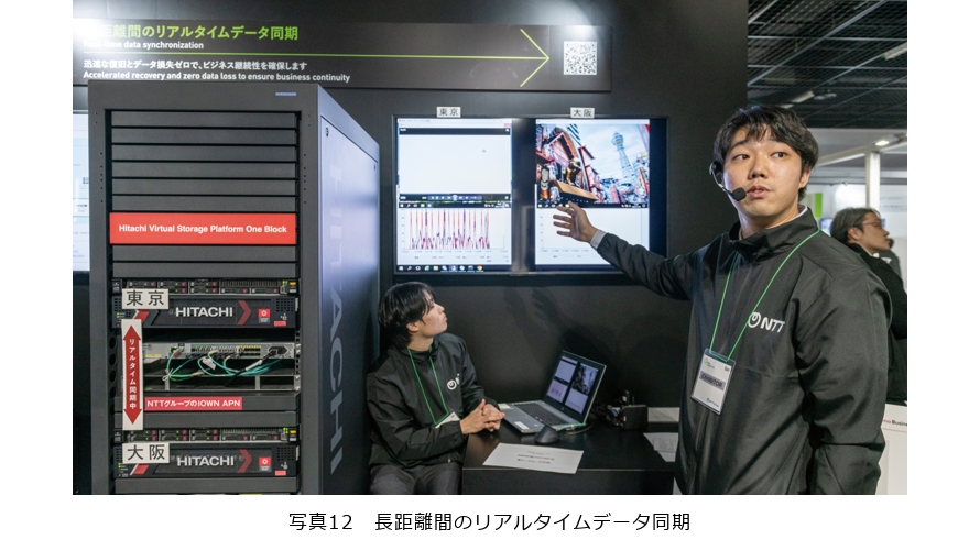 遠隔地間のストレージをリアルタイムに同期させ、あたかも1台のストレージであるかのように扱う「長距離仮想ストレージ」技術を、IOWN APNと組み合わせて検証した成果を紹介するのが今回の展示です(写真12)。従来の通信回線では「長距離仮想ストレージ」を可能にできる距離に限界があり、およそ100kmが実用的な上限とされてきました。これは通信回線の往復応答時間が大きな要因で、複数ストレージの同期を成立させるためには20ミリ秒未満の往復応答時間が求められていたためです。