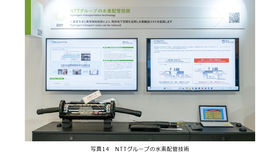 NTTは、電気やガスなど既存のエネルギーインフラに水素を加えるべく、独自の配管技術を開発しています(写真14)。水素は究極のグリーンエネルギーとなり得ますが、その普及は水素ステーション不足や輸送の難しさが大きな課題です。パイプライン(配管鋼材)やボンベで水素を輸送する際、金属表面から水素原子が材料内部に吸収され、集積した水素原子が金属原子間の結合力を弱める「水素脆化」という現象を引き起こします。この現象を防ぐため、パイプやボンベには「水素脆化」を起こさない特殊な金属や素材が必要になります。また水素は地球上でもっとも軽くもっとも小さい2原子分子であり、他の気体に比べて多くの材料を透過してしまうという特徴があります。そこで、これらに対応した特殊な二重配管方式のパイプを開発し、都市部で既存の地下空間を活用し、低コスト化を実現します。このパイプラインを埋設して安全に水素を供給できる体制を確立するのが、この技術の根幹です。