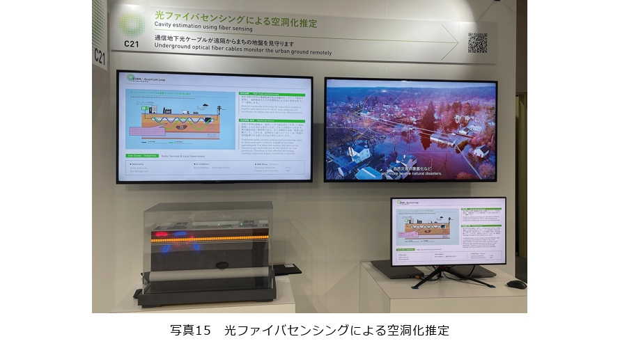 今回のR&Dフォーラムに先立つ報道発表で、既設の通信光ファイバを活用し、地盤の空洞化を推定する技術を公開しました。これは、埼玉県八潮市での事故が記憶に新しい道路陥没事故の予兆を推定する技術です。この事故は社会的に大きな注目を集めましたが、従来技術は、電磁波や超音波レーダを搭載した自動車による走行調査などを利用した地表からの計測が主流でした。しかし、これはコスト的に数年に1度しか行えないなど、状況の変化を見つけるために高頻度な測定が難しく、かつ地表からの3 m未満の浅い個所しか推定できないという欠点がありました。空洞調査で必要なのは地中の深い部分(3m以上)のモニタリング技術で、そこで注目されたのが産業技術総合研究所(産総研)で考案された、地盤工学的なアプローチである特殊なアレイを個別に配置する方法と、NTTが有する「光ファイバセンシング」という方法です(写真15)。産総研とNTTによる共同研究で検証した結果、2つの技術はおおむね同性能でした。しかし、産総研の方式は、対象個所へ新たにアレイを設置する必要があるのに対して、NTTの光ファイバケーブルはすでに通信用として全国各地の地下に敷設されているため、遠隔から地盤の状況を調査でき、圧倒的に低コストで実施することができます。また、地盤の空洞化というのは、徐々に進行していくもので、その進行度を調べるためには常時に近い頻繁なモニタリングが必要となります。その点でも「光ファイバセンシング」には一日の長があるといえます。この技術は、2026年度に全国各地の自治体と協力して実証実験を進め、2027年にはプレサービスを計画しています。NTTでは技術精度をさらに向上させて、地盤陥没リスクを早期発見し、地域の安心・安全に貢献したいと考えています。