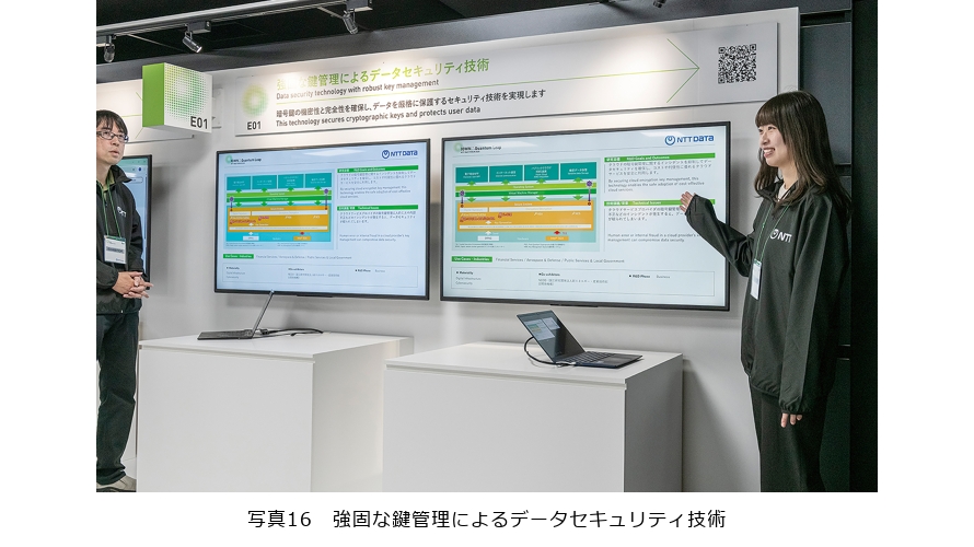 NTTではクラウドの暗号管理に関するインシデントを抑制してデータセキュリティを確保し、コストや利便性に優れる「暗号鍵」を実現しました(写真16)。暗号鍵とは機密データなどを第三者が理解できない形式に変換するための暗号化アルゴリズムに使用される文字列のことで、データの保護や認証、デジタル署名などに利用されます。この暗号鍵は通常、クラウドサービス内で保護・管理されていますが、プロバイダの暗号鍵管理に人的ミスや内部不正などのインシデントが発生すると、セキュリティが破られてしまう可能性があります。本技術はクラウドのTEE(Trusted Execution Environment: 高信頼実行環境)で暗号鍵の生成、運用を一元管理することによって、強固なセキュリティを確保するとともに耐量子暗号にも対応しています。特筆すべきはNIST(米国国立標準技術研究所)というアルゴリズムの評価認定をする組織があり、この認定をパスすることが信頼できるライブラリである証明となりますが、現在、この評価試験をパスする仕組みの暗号鍵技術を持つのは、国内でNTTだけです。政府機関や重要物資を製造している企業がこの暗号鍵を使用することによって、国家機密や企業秘密などの重要なデータを厳格に保護し、安全が担保できます。