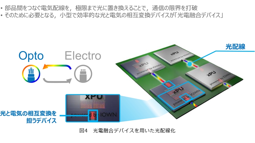 PEC-1を用いた高速・大容量・低遅延なネットワークサービスが「APN IOWN 1.0」で、2023年に商用化しました。2025年に開始されたIOWN 2.0ではいよいよ光電融合デバイスをコンピュータの内部に適用していきます。進化した光電融合デバイス(PEC-2)を用いて、コンピュータボード間の電気配線を光の配線に置き換えていきます(図4)。