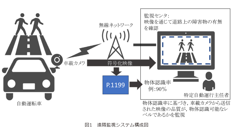 自動運転のレベルはSAE(Society of Automotive Engineers:モビリティ専門委員会)により規定されており、運転主体や走行可能エリアに応じて、レベル0からレベル5まで6段階が定義されています(1)。その中でレベル4に相当する、運転者がいない状態での自動運転(特定自動運行)を行う場合においては、遠隔監視装置を設置し、遠隔監視を行う者(特定自動運行主任者)を配置することが法令で定められています(2)。図1に示すように、特定自動運行主任者は、自動運転を行う車載カメラから監視センタに送信された車載映像を基に、自動運転の作動状態の確認や道路上における障害物有無の確認を行います。そのためには、車載カメラから送信される映像品質が、特定自動運行主任者から物体を認識できる程度に鮮明である必要があります。そこでNTTは、特定自動運行主任者が車載カメラから送信された映像を視聴した際に物体を認識できる確率を導出する技術を確立しました。本技術は、2025年11月にITU-Tによって勧告P.1199として標準化されました。本技術を利用することで、物体認識率に基づき、車載カメラから送信された映像の品質が、物体認識可能なレベルであるかを監視することができます。