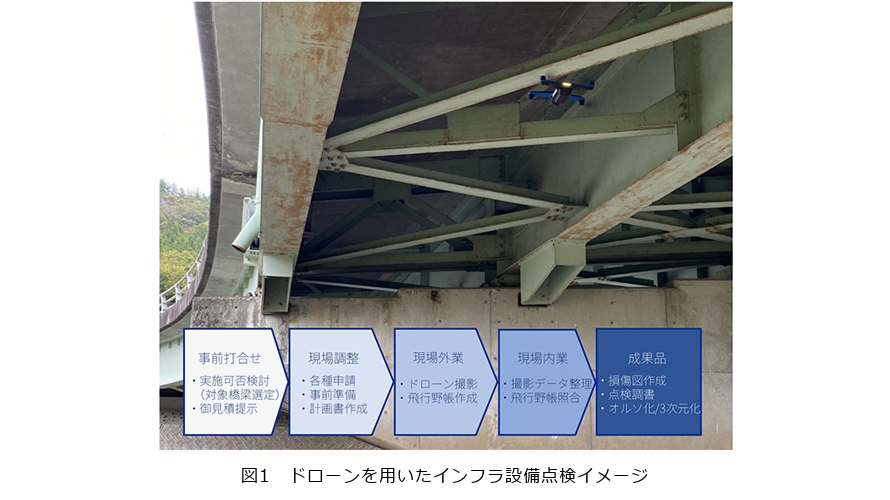 また、高性能な機体とこれまでの橋梁点検で蓄積してきた運用ノウハウに加え、既存手法も含めた橋梁点検を熟知したメンバとで点検内容をコーディネートしています。発注元の建設コンサルタントからの要望を踏まえ、ドローンなどの新技術と既存技術の優位性を交え、橋梁の状況に合わせた点検を提案しています(図1)。