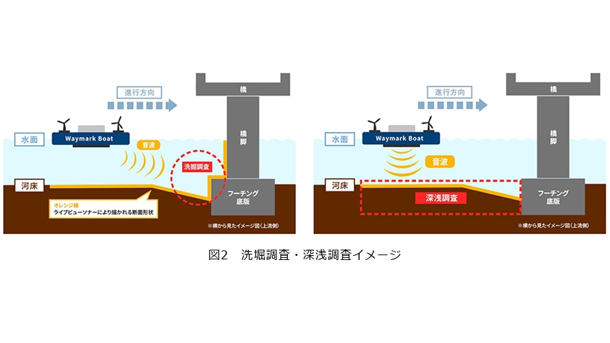 さらに、自社開発のボート型ドローン(Waymark Boat)による洗堀*1調査を行っています。「レッドロープ測定」と呼ばれる、重錘付きロープを用いて橋上から河床高さを測定する従来手法の場合、測定者のスキルや強風の影響により測定誤差が発生するだけでなく、橋梁上の交通に対する作業員の安全確保に課題がありました。ボート型ドローンによる調査では、従来手法と比較して測定数を容易に増やせ品質向上が期待できるほか、安全な場所から測定でき、作業時間の短縮も見込めます(図2)。
