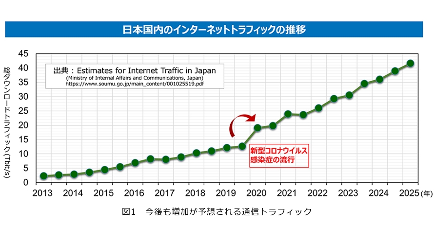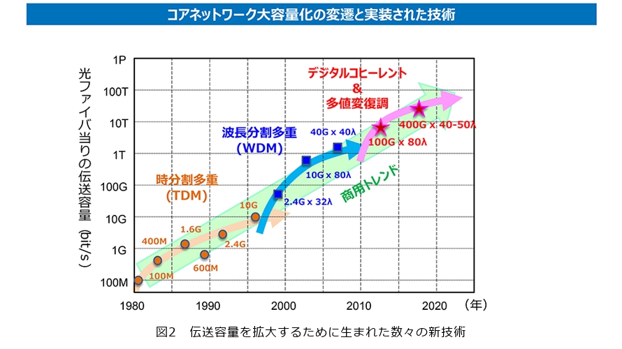 高精細映像配信などの普及や拡大を中心に世界的に通信トラフィックは増加の一途を辿っています。特にコロナ禍を経て在宅でのリモートワークやオンライン会議などの需要も急激に拡大し、生成AI(人工知能)の普及なども重なって、今後もこの通信トラフィックの増加は続く見込みです(図1)。こうした社会背景から、2012〜2013年ごろにデジタルコヒーレント*と呼ばれる新しい技術が商用導入され、シリコン系半導体の微細化の進展とともに、大規模なデジタル信号処理回路(DSP:Digital Signal Processor)、デジタル/アナログ変換器(DAC:Digital to Analog Converter)やアナログ/デジタル変換器(ADC:Analog to Digital Converter)の性能改善が進み、当初は1波長当り100Gbit/sの伝送容量だった光通信が、現在は400Gbit/sを超え800Gbit/sまでに進展しています(図2)。
