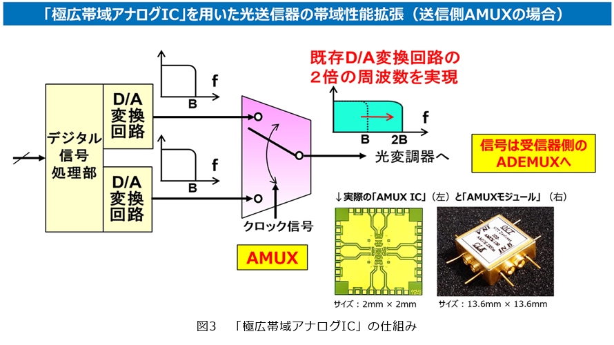 私が提案している「極広帯域アナログIC」には、送信側に設ける「AMUX」と受信側に設ける「ADEMUX」があります。これらのICはアンプ(増幅)とミキサ(周波数変換)、そしてコンバイナ(合波)などの機能を併せ持つICです。これらのICを従来のDACやADCと組み合わせて使用することで、従来の光送信器や光受信器が有している帯域性能面での制限要因をなくし、限界を突破しようと考えています(図3)。