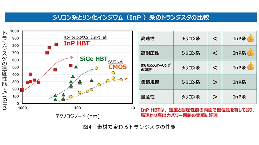 現在の汎用的なICにはシリコン系半導体(CMOS:Complementary Metal Oxide Semiconductor)が主に使われていますが、2019年の段階ではNTTが長年研究開発を進めてきた「InP HBT(リン化インジウム系ヘテロ接合バイポーラトランジスタ)」という高速トランジスタ技術を活用したICを設計し、作製しました。このInP系半導体は、シリコン系半導体に比べて集積規模(多機能性)や量産性などいくつかの不得手な部分はみられるものの、高速性や高耐圧性においては目覚ましい向上を図ることができます(図4)。その結果、世界に先駆けて110GHz帯域を持つAMUXおよびADEMUXを実現しました。