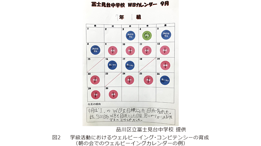 他のアレンジ型の実践としては、学級活動での実践が挙げられます。朝の会で日直が「今日、クラスで大事にしたいウェルビーイング」を全員に紹介し、その毎日の記録を「I」「WE」「SOCIETY」などのカテゴリー別に色分けし、1カ月のカレンダーを作成することにより、クラスで大事にしたいことを可視化したり、行事による日々の変化をひと目で把握できるようになりました(図2)。これにより、クラスの前日の反省を自分の今日の行動に活かすなど、生徒は自分自身のことだけではなく、クラス全体について考えることを習慣化できるようになったとのことです。