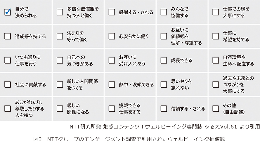 教育で取り組んできたウェルビーイングの知見を企業のさまざまな実務へも展開していきたいと考えています。まず最近の話題としては、NTT総務部門と連携した従業員エンゲージメントに関する取り組みがあります。NTTグループ全従業員に対して毎年実施されている調査では、2023年度から「ウェルビーイング価値観」の視点で作成した質問を導入いただいています(図3)。