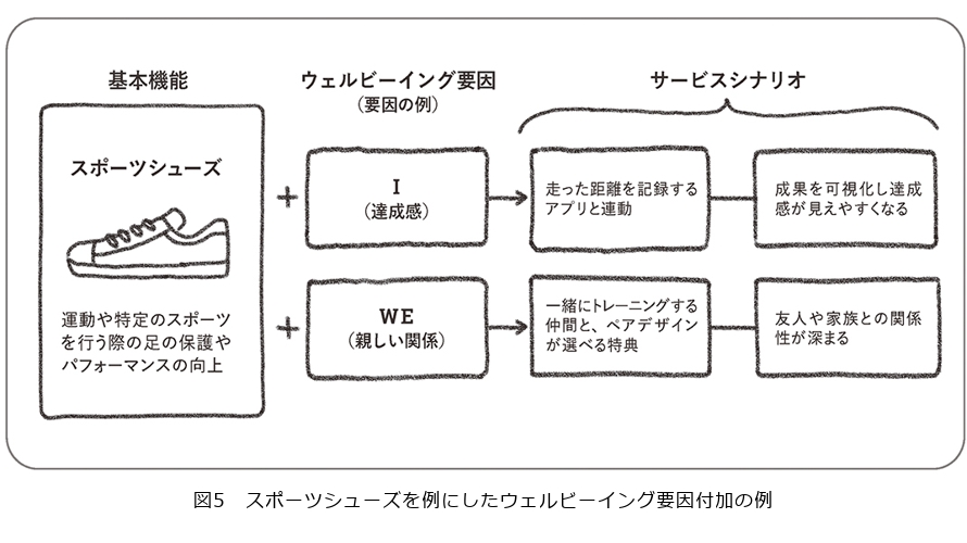 アレンジ型について具体例を挙げて考えてみましょう。例えば、スポーツシューズという製品は、その基本機能として「スポーツを行う際の、足の保護、パフォーマンスの向上」があります。そして、そこにアレンジとして、走った距離を記録するアプリとの連動を考えると、ユーザは達成感を感じやすくなるでしょう。別のアレンジとして、一緒にトレーニングする仲間とペアデザインが選べる特典が付いたら、関係性を深めることができるでしょう(図5)。同じ基本機能でも、どのようなウェルビーイングに着目してアレンジするかで、そのサービスの価値が変わるのです。