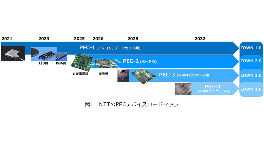 図1にNTTのPECデバイスのロードマップを示します。IOWN 1.0 では、2023年より商用サービスが開始されたAPN(All-Photonics Network)において、PEC-1を活用したデジタルコヒーレント光トランシーバを導入しました。これは既存の光ネットワークに比べ高効率で安定した長距離伝送を可能にするもので、IOWNの基盤となる通信品質の向上に寄与しています。
